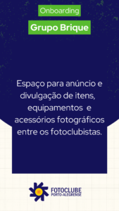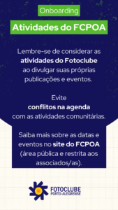 • Combine que cada participante enviará entre 5 e 10 fotos para a publicidade do FCPOA (álbum FCPOA). Em caso de espaços que desejem fotos, defina as regras antecipadamente (importante indicar a autoria da foto e do FCPOA).