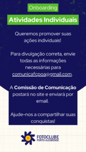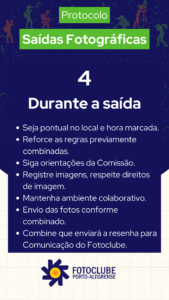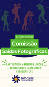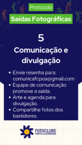 2. Comunicação e Divulgação: A equipe de comunicação cuida da divulgação, usando arte e agenda específicas para promover a saída. Comunique suas atividades e compartilhe as fotos dos bastidores registradas para enriquecer o acervo do Fotoclube.