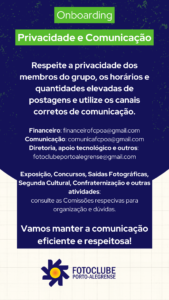 Fotoclube Porto-alegrense https://acessorestrito.fotoclubepoa.com.br Clube de Fotografia Sat, 05 Aug 2023 22:59:48 +0000 pt-BR hourly 1 https://wordpress.org/?v=6.9 Protocolo-Grupo WhatsApp FCPOA https://acessorestrito.fotoclubepoa.com.br/protocolo-grupo-whatsapp-fcpoa/ https://acessorestrito.fotoclubepoa.com.br/protocolo-grupo-whatsapp-fcpoa/#respond Sat, 05 Aug 2023 22:42:00 +0000 https://fotoclubepoa.com.br/acessorestrito/?p=5311 Seja bem-vindo(a) à nossa comunidade fotográfica unida! Juntos, podemos aproveitar ao máximo nosso grupo de WhatsApp, valorizando o respeito mútuo e mantendo o foco na fotografia. Vamos (re)conhecer as regras e fortalecer ainda mais nossa paixão compartilhada. Esteja por dentro e faça parte dessa experiência inspiradora!