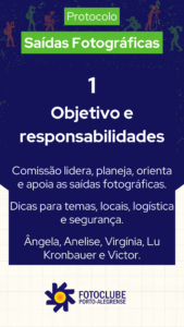1. Objetivo e Responsabilidades: A Comissão de Saídas Fotográficas, liderada por Angela, Anelise, Virgínia Guimarães, Lu Kronbauer e Victor Ghiorzi, é responsável por planejar e organizar as saídas. Seu papel envolve apoiar todas as etapas da organização da saída, bem como fornecer dicas para a seleção de temas e locais, coordenação logística, segurança e orientação durante as atividades.