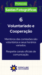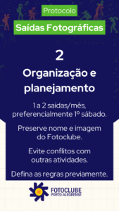 2. Organização e Planejamento: Qualquer membro do fotoclube pode organizar saídas, mas é crucial seguir o protocolo. É razoável ter entre 1 e 2 saídas por mês, preferencialmente no 1º sábado, preservando o nome e a imagem do fotoclube. Reserve a data, evitando conflitos com outras atividades do clube.